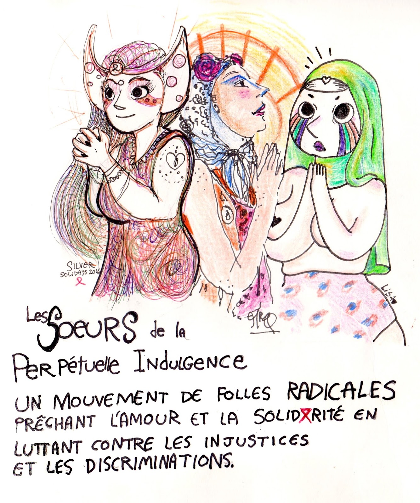 (Illustration des Soeurs de la Perpétuelle Indulgence réalisée à trois mains avec mes collègues dessinateurs-trices, les mirifiques Monsieur Q et Lisa.)